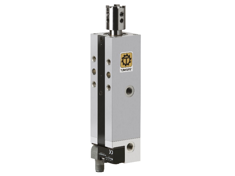 Retract cylinder with mounting hole on pistonrod for centering pins, Compact housing of highstrength aluminium material, Drive via round cylinder Ø 30 for thrust and tensile forces of up to approx. 350/250 N, Push rod secured against twisting in bronze bushing, Integrated inductive sensors, Combined stroke 20 mm, Intermediate stroke lengths upon request.