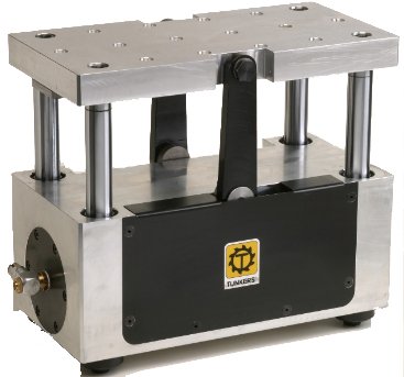 Solid, fully enclosed housing, High quality re-circulating linear ball bearings (Brand: Star) enclosed in housing, Driven by two pneumatic cylinders Ø 80 mm, Four rigid guide posts with Bronze-Graphite Bushings, Top plate hole pattern optional, Position indicators at both positions.