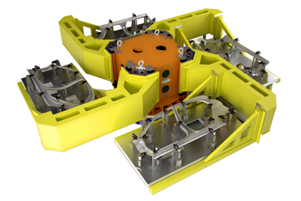 The Expert-Tünkers Rotate-Lift-Unit is a tool-changing concept to enhance the flexibility of your production line. The system is based on one EDH-Heavy-Duty Rotary Table, similar to the BMW Multitooling. This table is used as buffer for up to four different toolings. First the required tooling is selected by the rotation of the buffer table. Afterwards the selected tooling is precisely positioned by the integrated lifting mechanism.