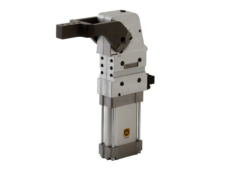 Vario clamp with toggle joint mechanism and continuously adjustable opening angle, Over-centre-lock, Enclosed aluminium housing, Oval-shaped cylinder in the sizes 50, 63, 80, Forked clamping arm, standard hole pattern for adapting contour blocks, Continuously adjustable opening angle 5°-135°, optional: Weld immune inductive sensing of closed and opened position (T12)